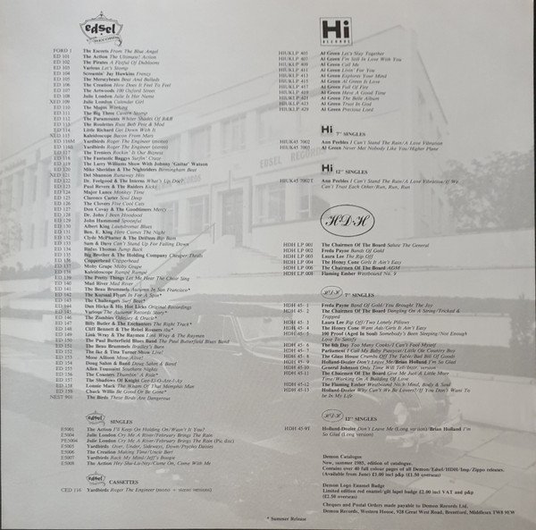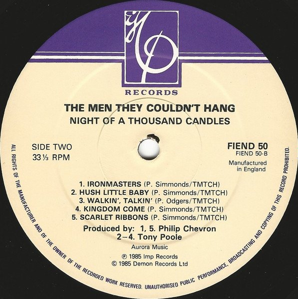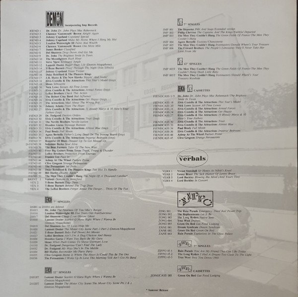 Picture sleeve with plain generic inner. Some copies included an advertising insert for other Demon Records releases. Recorded at Elephant Studios, Wapping. Mastered at CBS. Stamper/Metalwork at Musitech, High Wycombe. All tracks published by Aurora Music except A5 Roberton Brown Assoc Ltd. [Labels]: ℗ 1985 [except A5] ℗ 1984 Imp Records. © 1985 Demon Records Ltd. [Sleeve]: © 1985 Demon Records. Imp Records is a division of Demon Records Ltd Brentford, Middlesex. Manufactured in England.