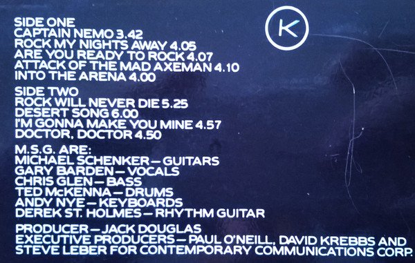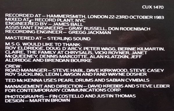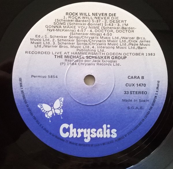 "Grabado en vivo en Hammersmith Precio Especial" printed on front cover. Recorded at - Hammersmith, London 22-23rd October 1983. Ted McKenna uses Pearl Drums and Sabian Cymbals. Ed.: A1,A3,A4,A5 Schenker Songs / Chrysalis Music Ltd. A2 Paper Music Ltd. / Warner Bros. Music Ltd. Ed.: B1 Schenker Songs / Chrysalis Music Ltd. / Warner Bros. Music Ltd. B2 Schenker Songs / Chrysalis Music Ltd. / Dick James Music Ltd. B3 Schenker Songs / Chrysalis Music Ltd. / Pape Music Ltd. / Warner Bros. Music Ltd. B4 Intersong Music Ltd. / Barn Publishing Ltd. B5 previously released by [a153677] in 1974 [m=35284] album.