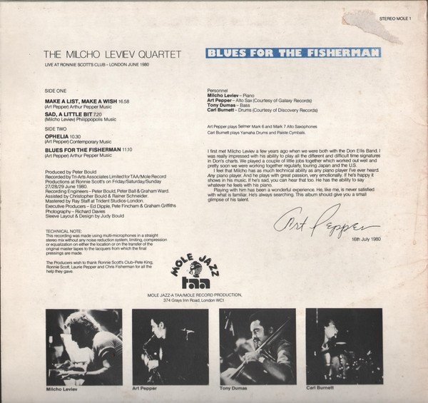 Recorded by Tri-Arts Associates Limited for TAA/Mole Record Productions at Ronnie Scott's on Friday/Saturday/Sunday 27/28/29 June 1980. Technical Note: This recording was made using mutli-microphones in a straight stereo mix without any noise reduction system, limiting, compression or equalization on either the location or on the transfer of the original master tapes to the lacquers from which the final pressings are made. The producers wish to thank [l97075] Club - [a293073], [a272669], [a1367847], and Chris Fisherman for all the help they gave. A TAA/MOLE Production © & ℗ 1980