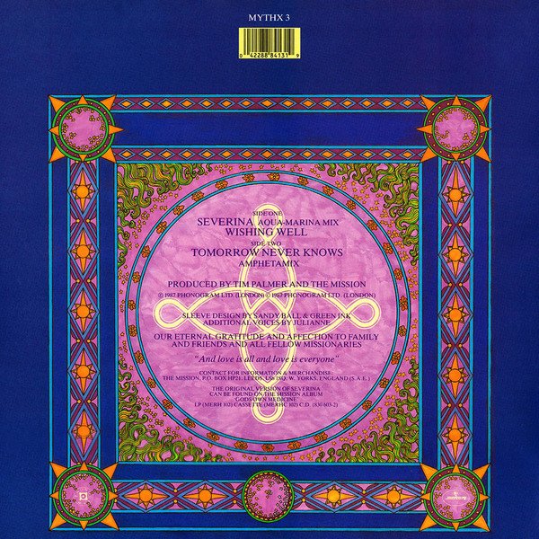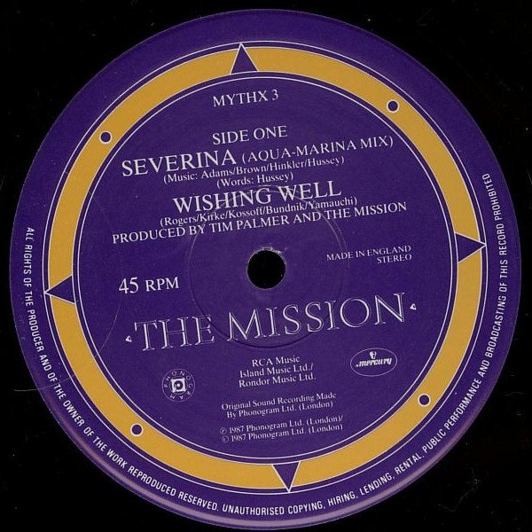 Love You To Death (track B2) is an instrumental, an acoustic guitar intro of Love Me To Death which was edited off the original version of Love Me To Death so the song could fit onto the "God's Own Medicine" LP (The full length version is now available on the remastered "[url=http://www.discogs.com/release/1079195]God's Own Medicine[/url]" CD released in 2007). It's not quoted on the sleeve or vinyl labels but it's actually on the record. The track first appeared with the title "Love You To Death" on the CD Video single of "[url=http://www.discogs.com/release/770938]Wasteland[/url]" which came out about a year later. The original version of "Severina" can be found on The Mission album 'God's Own Medicine' [url=http://www.discogs.com/release/393625]LP[/url] (MERH 102) [url=http://www.discogs.com/release/920496]Cassette[/url] (MERHC 102) [url=http://www.discogs.com/release/395571]C.D.[/url] (830 603-2) A1: RCA Music A2: Island Music Ltd./Rondor Music Ltd. B1: Northern Songs Original sound recording made by Phonogram Ltd (London) ℗ 1987 Phonogram Ltd (London) © 1987 Phonogram Ltd (London) Made in England Track durations not listed on the release. "And love is all and love is everyone"