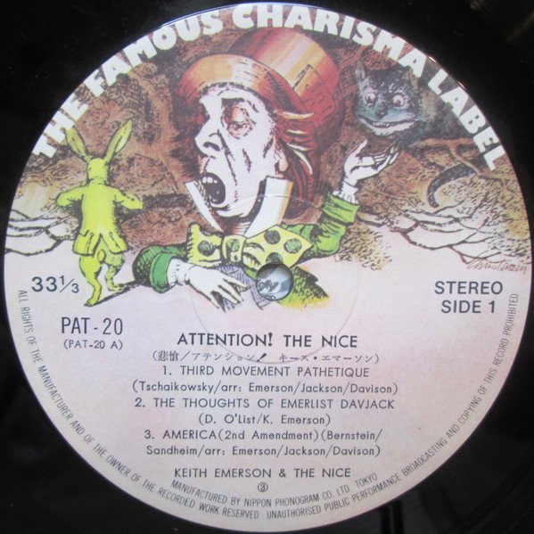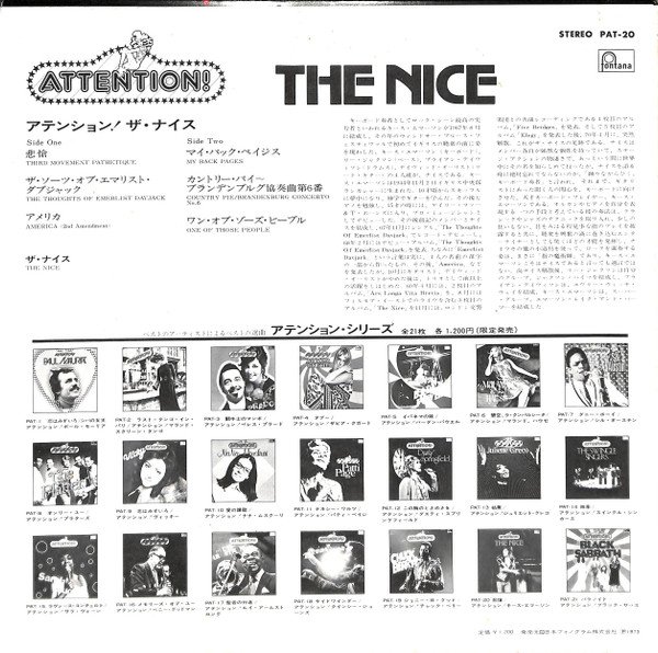 Issued with obi & insert. Runouts are stamped. This was also reissued with same track list but different cover photograph and credited to Keith Emerson & The Nice: [r=2828691]