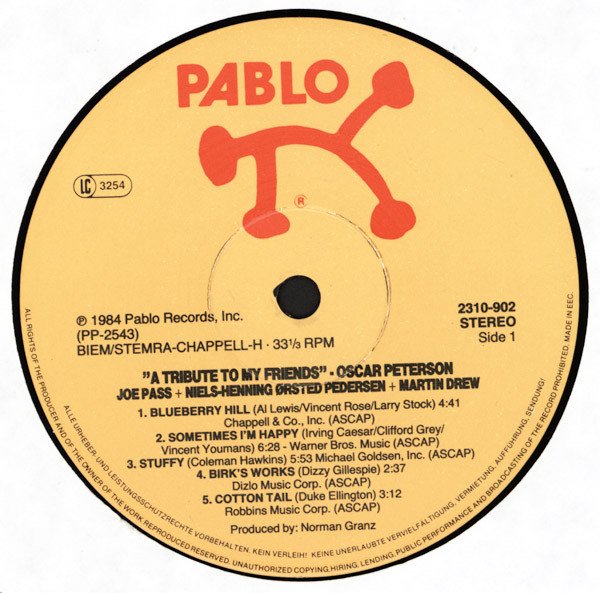 Made in EEC. Recorded November 8, 1983 Oscar Peterson plays Bosendorfer Piano. Joe Pass plays Ibanez Guitar. Publishers: A1: Chappell & Co., Inc. (ASCAP) A2: Warner Bros. Music (ASCAP) A3: Michael Goldsen, Inc. (ASCAP) A4: Dizlo Music Corp. (ASCAP) A5, B2: Robbins Music Corp. (ASCAP) B1: MCA, Inc. (ASCAP) B3: Carmichael Music Pub., Inc. (ASCAP) B4: Atlantic Music Corp. (BMI)