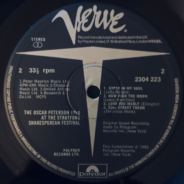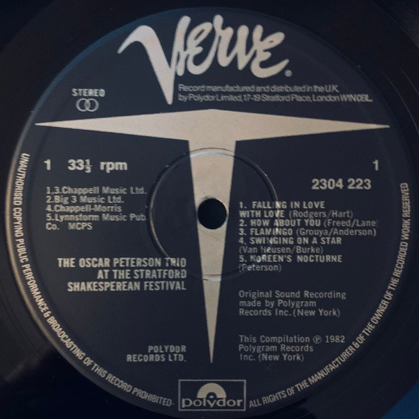Recorded Stratford, Ontario, Canada, August 8, 1956. Track B1: Writer erroneously credited to 'Jaffa,' which should be 'Jaffe.' Back cover: Artist erroneously credits Ray Brown for "(dr)," which should be "(b)," and Herb Ellis for "(s)," which should be "(g)." Track publishers: A1, A3, B2: Chappell Music Ltd. A2: Big 3 Music Ltd. A4: Chappell-Morris A5: Lynnstorm Music Pub. Co. B1: Peter Maurice Music Ltd.-KPM-EMI Music B3: United Artists Music Ltd. B4: Bosworth & Co. Ltd.
