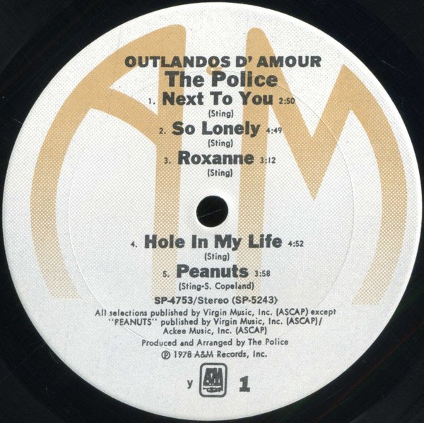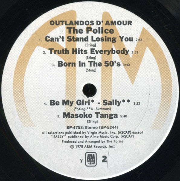 Recorded at Surrey Sound Studios. "y" to the right of A&M logo on label denotes a [l403953] pressing. Pressings of this record exist with The Police logo on the jacket in colors other than green. Yellow logo version can be found here: [r=2424236]