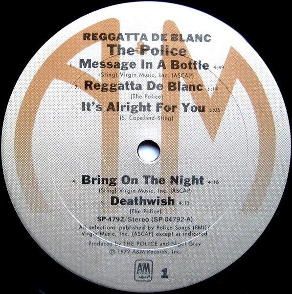 [l376197] pressing denoted by "S 1" etch in runouts. Issued with photo inner sleeve. Recorded at Surrey Sound Studios. A1, A4, B1, B3, B6 published by Virgin Music, Inc. A2, A3, A5 published by Police Songs / Virgin Music, Inc. B2, B4, B5 published by Police Songs