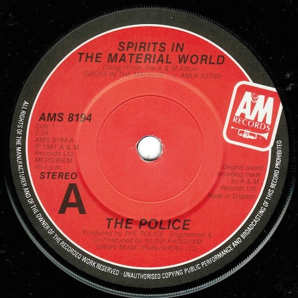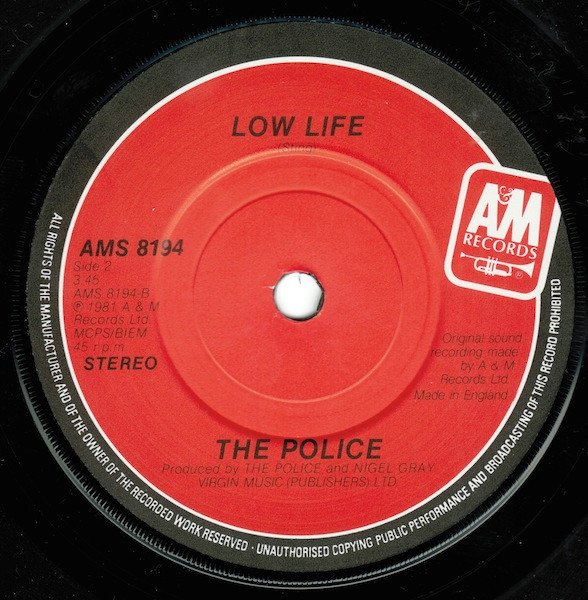 ℗ 1981 A&M Records Ltd. © 1981 A&M Records Ltd. Track A from the A&M album "[url=http://www.discogs.com/release/1606397]Ghost In The Machine[/url]" - AMLK 63730. Track B previously unreleased. Original sound recording made by A&M Records Ltd. (Published by) Virgin Music (Publishers) Ltd. Made in England. [Ghost in The Machine Logo]TM is a service mark of Roxanne Music Overseas Ltd. Title deleted March 1988.