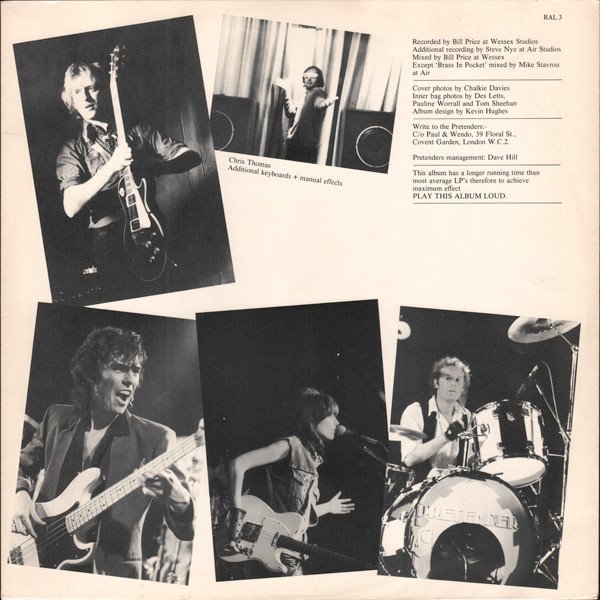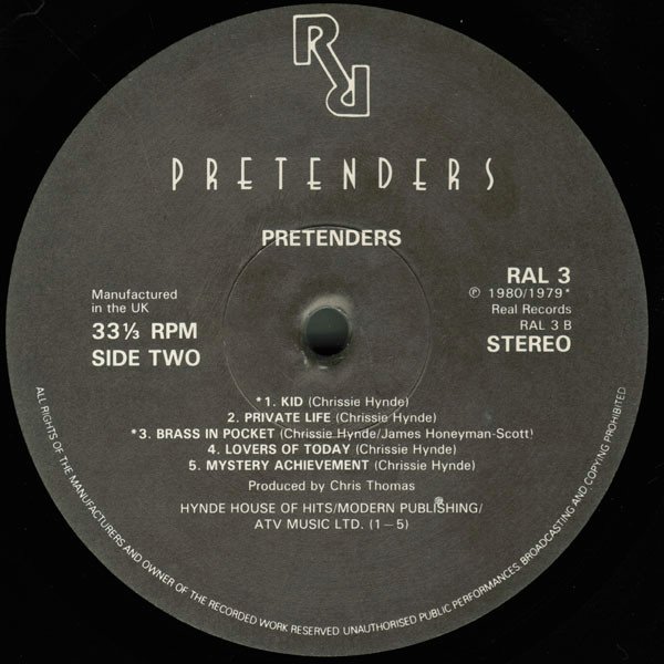 Similar to [r=9204847] but this version has slightly different text on the rear cover: "Produced by Chris Thomas STOP YOUR SOBBING Produced by Nick Lowe" Also that version displays different pressing rings under the labels: a deep groove ⅓ from the centre and a steep dip ⅔ from the centre. Issued in a card picture sleeve with card printed inner, custom black & white labels; most copies have a sticker on the front cover stating: "Featuring The Singles 'Stop Your Sobbing' 'Kid' 'Brass In Pocket'". On labels: Manufactured in the UK ℗ 1980/1979* *A4, A6, A7, B1, B3 [Publishers, all tracks] Hynde House Of Hits/Modern Publishing/ATV Music Ltd. [except A7] Kassner Associated Publishers Ltd. On rear cover: ℗ 1979 A Real Recording distributed by wea Records Ltd. © A Warner Communications Co. (...) Printed and made in England. Runouts are etched.