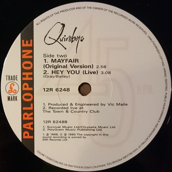Limited Edition with Double Sided Poster. Publishers: A, B2: Polygram Music Publishing Ltd ℗ 1990 EMI Records Ltd. B1: Survival Music Ltd./Chrysalis Music Ltd ℗ 1988 EMI Records Ltd. B2: recorded at The Town & Country Club. Nov. 1989. ℗ © 1990 EMI Records Ltd.
