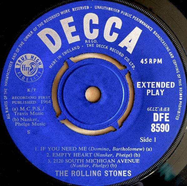 Recorded in Chicago, U.S.A. © 1964, The Decca Record Company Limited, London. A1 published by Travis Music / M.C.P.S. A2 & A3 published by Nanker, Phelge Music B1 published by Leeds Music B2 published by Jewel Music / M.C.P.S. Printed in England by MacNeill Press, London, S.E.1. The ending characters of 2D and 1 in the runouts of sides A, B are rotated 90 degrees counter-clockwise.