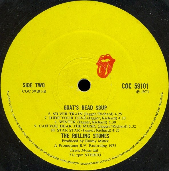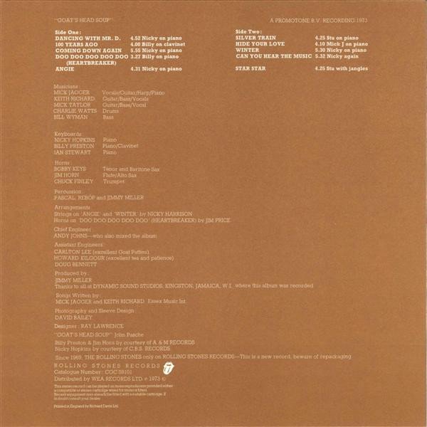 Original UK release in matt gatefold cover on yellow Rolling Stones Records labels. Includes two LP-sized inserts: • Brown thick paper credits/photos insert. • Standard Paper 'Goat's Head Soup' insert. Thanks to all at Dynamic Sound Studios, Kingston, Jamaica, W.I. where this album was recorded A Promotone B.V. Recording 1973 ℗ 1973 Billy Preston & Jim Horn by courtesy of A & M Records Nicky Hopkins by courtesy of C.B.S. Records Published by Essex Music Int. Since 1969, The Rolling Stones only on Rolling Stones Records - This is a new record, beware of repackaging Distributed by WEA Records Ltd. ℗ 1973 © Printed in England by Richard Davis Ltd. Rarely, the promotional "Goat Head Soup" sticker by John Pasche can be found with the record, mainly attached to the top right sleeve. Here is what Pasche, the cover art designer said in an interview: „At a very late stage they decided to use some new photos of the band for the cover and the soup images were used as a folded poster with the album and also for stickers promoting the album’s release.“ These exact stickers alone pop up from time to time without the record and also have been found on the second matrix variation. These facts, their rarity and their "promotional character" would lead to the conclusion that they have not been an integral part of the first album release. Maybe the company handed them out to some stores who either gave them away as a gift or put them on the sleeves. This release is without 'Made In UK' printed on labels above 'Side One' and 'Side Two', contrary to later [r=9382431] and [r=17123736]. The runouts are stamped, except for 'ROLLING STONES RECORDS' which is etched.
