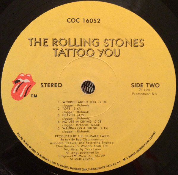 "SP" suffix in label matrix and "E A S T" is embossed around the center hole (typically on side B) denote a [l=Specialty Records Corporation] pressing. Label variant without "SP" on labels is at [r=8847531]. "EDP" within an oval circle stamped in runouts denotes that metalwork (plating) was done by [l=Europadisk]. The initials "RL" etched next to the "MASTERDISK" stamp in the runouts indicate that the original lacquers were cut by Bob Ludwig. Issued with a heavy cardstock custom-printed inner sleeve with artwork and credits. Originally issued with a hype sticker on the shrinkwrap. On the earlier copies the sticker states: "Includes Start Me Up COC 16052" and on later copies: "Includes The Hit Singles Waiting On A Friend And Start Me Up COC 16052". Some copies with promotional gold stamp on back cover. Artist on jacket front: "Rolling Stones" Artist on jacket spine, labels: "The Rolling Stones" Track A6 title on rear sleeve: "Neighbors" Recorded at EMI, Paris & Nassau, Bahamas. Associate producer & engineer: [...] for Wonder Knob, Ltd. Mastering [...] for Masterdisk. All songs published by Colgems-EMI Music Inc., ASCAP. Rolling Stones Records™ Musidor B.V. ℗©1981 Promotone B.V. Printed in U.S.A.