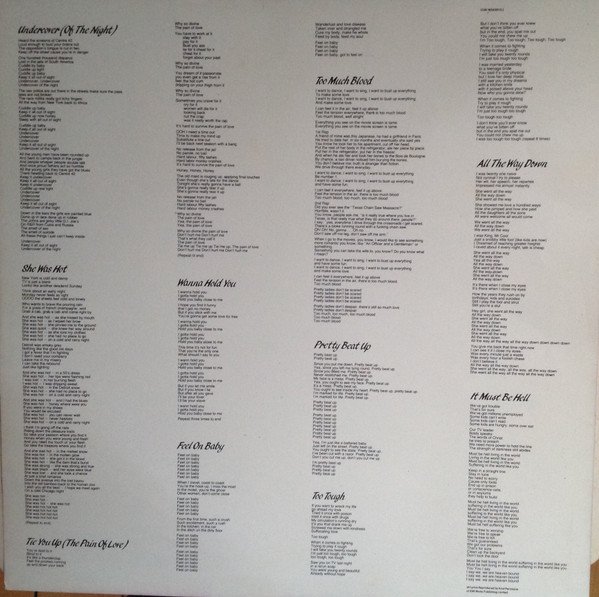 ℗ 1983 Original sound recordings made by Promotone B.V. © 1983 Promotone B.V. Differs From: [r=1595734]: Different label layout. Rim text starts at opposite side On the front sleeve some copies have a sticker with the text: includes SHE WAS HOT & UNDERCOVER... CUN 1654361 Comes with a thin card picture/lyric insert and a thin card inner sleeve; some intitial copies also have a merchandising insert with the LP's cat. no. (CUN 1654361) printed at the top right corner. Stamped runouts with NICKZ signature etched.