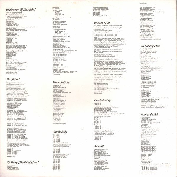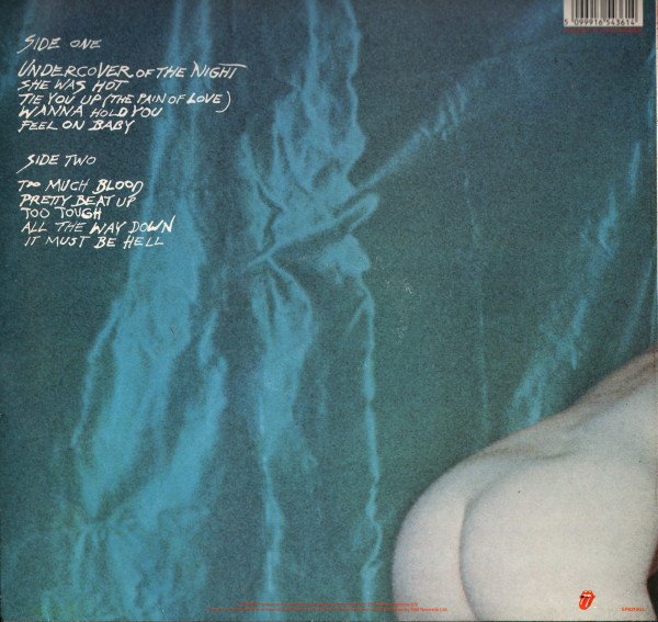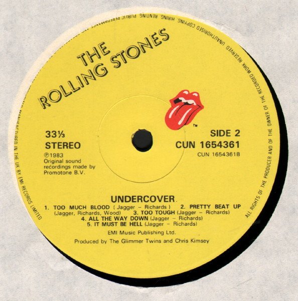 Comes with a thin card insert with lyrics and artwork, and a thin card inner sleeve; some initial copies also have a merchandising insert with the LP's catalogue number (CUN 1654361) printed at the top right corner. Some copies have a hype sticker on the front cover, top right: "includes SHE WAS HOT & UNDERCOVER..." Artist on labels: The Rolling Stones Track A1 on insert: Undercover (Of The Night) Inner sleeve: Recorded at EMI Studios, Paris, France; Compass Point Studio, Nassau, Bahamas. Recorded for Wonderknob Ltd. Mixed at the Hit Factory, New York City. Labels: Manufactured In The UK By EMI Records Limited. ℗ 1983 Original sound recordings made by Promotone B.V. All runouts are stamped, except "NICKZ" etched.