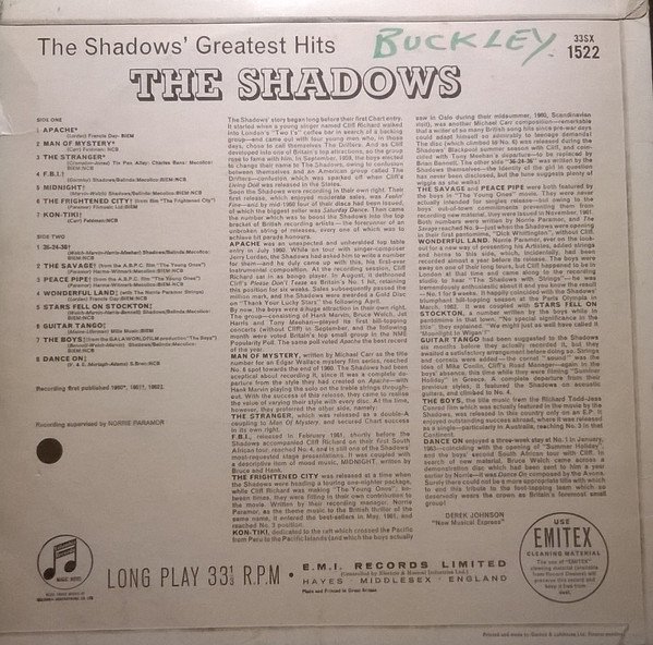 On the Labels Columbia Columbia Gramophone Co. Ltd. Made in Gt. BritainOn the Sleeve Columbia E.M.I. Records Limited (Controlled by Electric & Musical Industries Ltd.) Hayes • Middlesex • England Made and Printed in Great Britain Printed and made by Garrod and Lofthouse Ltd. Patents pending