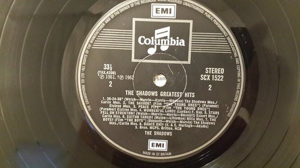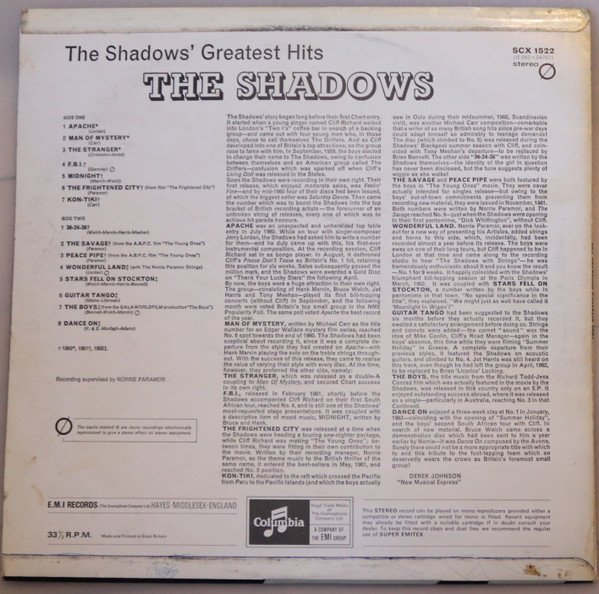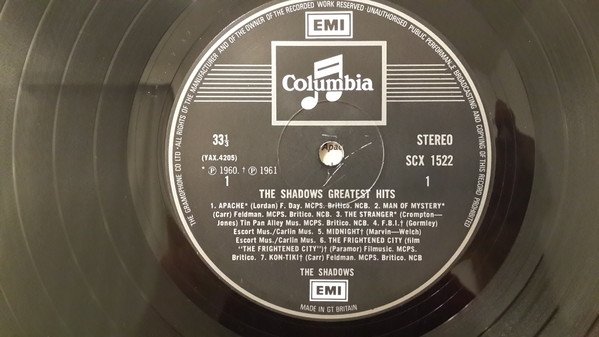 Silver on black labels with "Made in Gt Britain" at 6 o'clock and rim text starting with ""The Gramophone Co Ltd. Last line of text on B-side label begins "S. Bron. MCPS. Britico. NCB" unlike on [r9177289] and [r6669667] A4, B4 and B7 are mono recordings eƶectronically reprocessed to give stereo effect Issued in a flipback sleeve. Publishers A1, B4 F. Day., A2, A7 Feldman, A3 Tin Pan Alley Music, A4, A5, B5 Escort Music/Carlin Music, A6 Filmusic, B1, B7 The Shadows Mus./Carlin Mus., B2, B3 Elstree Mus., B6 Mills Mus., B8 S. Bron Rights A1, A2, A3, A7, B8 MCPS. Britico. NCB., A6 MCPS. Britico