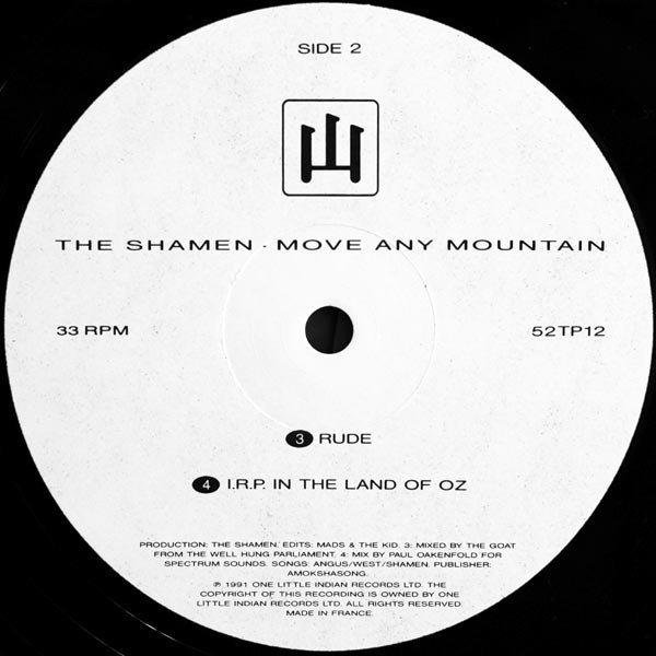 Track A1: Remixed for Chromium Managment. Mixed at Rollover Studios. Track A2: Mix created at Baad! Studios, Milton Keynes for Dy-Na-Mix. Track B1: Mixed by The Goat from The Well Hung Parliament. Track B2: Mix for Spectrum Sounds. ℗ 1991 One Little Indian Records Ltd. The copyright of this recording is owned by One Little Indian Records Ltd. © 1991 Artwork. © 1991 Me Company under licence to One Little Indian Records Ltd. Made in England. (Sleeve) Made in France. (Label) Durations are not printed on the release but are taken from digitizing during playback.