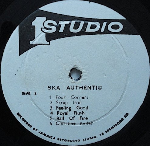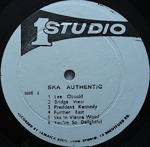 Sub-title : Presenting the ORIGINAL SKA-TALITES from JAMAICA. Produced By C.S. Dodd In Kingston Jamaica. Back cover lists 5 songs on A side. Label lists 6 songs on A side.This re-press dates from around 1973. It has the white Studio 1 label (coming just before the Orange Studio One labels of 1974/5) but still has the 'deep groove' on the labels confirming this early 1970s re-pressing.Also to note is that 'Authentic' is in a Red Box (originally in an orange box - changed in 1970), and the 'K' in 'Ska' is very light green. Originally this was just a Darker yellow and this again was changed in 1970.However this LP can be accurately dated to the early 1970s, as late 1970s & 1980s re-pressings have the 'K' in Ska in bright green! Also the vinyl has the 'deep groove' and is very thick.
