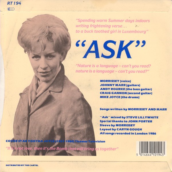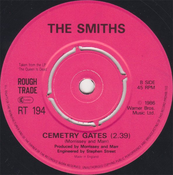 Dark pink paper labels with black text. Four prong push-out centre. Presented in a side opening flipback gloss card sleeve with a die cut thumb section. All songs recorded in London 1986 Cover star: Yootha Joyce (1927-1980) Thames Television Track B: Taken from the LP [url=http://www.discogs.com/release/494927]'The Queen Is Dead'[/url] © 1986 Warner Bros. Music Ltd. Made in England Runouts are machine stamped excepting: "ARE YOU LOATHSOME TONIGHT ?" and "TOMB IT MAY CONCERN" which are hand etched.