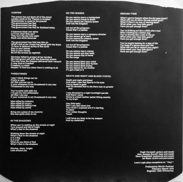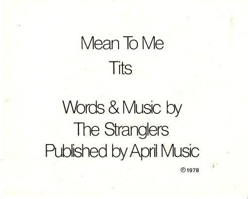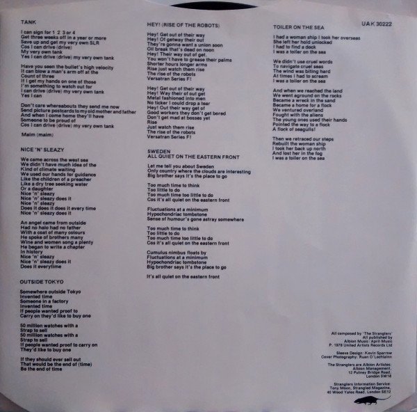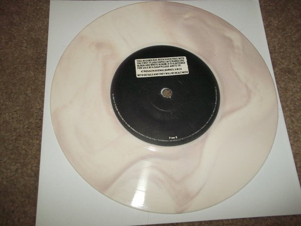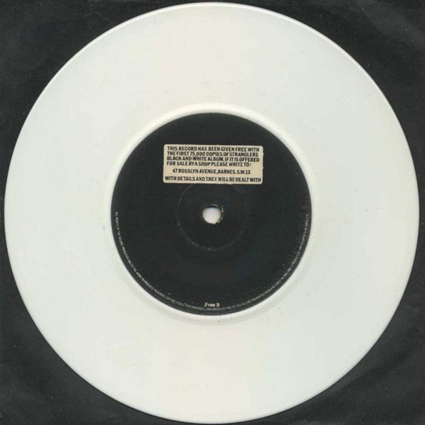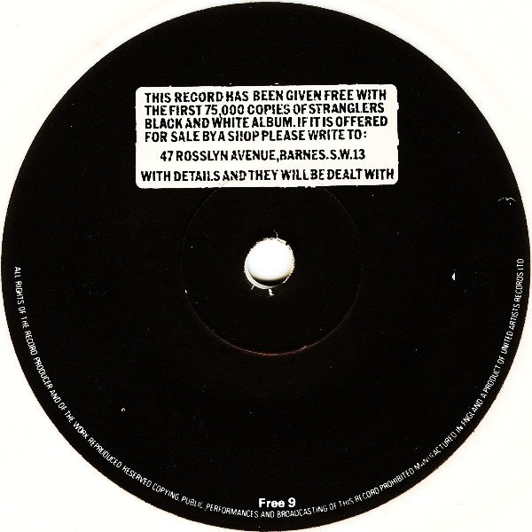 Printed lyric inner sleeve: Produced by Martin Rushent February/March 1978 The Stranglers are Albion Artistes: Albion Management, 12 Putney Bridge Road, London SW 18 Stranglers Information Service: Tony Moon, Strangled Magazine, 40 Wood Yates Road, London SE12. (notes on inner sleeve)Notes printed on 7" "Walk On By" Published by Carlin Music Ltd. "Mean To Me" & "Tits" Published by April Music.Track times are not printed on the release itself, and were taken by stopwatch.The first 75'000 copies of this album included a bonus 7" with Walk On By [side A], Mean To Me / Tits [side B] in white vinyl in a black paper sleeve; also containing an inlay card with credits. Over time a few of these white vinyl discs have suffered a colour stability issue, changing from white to pink/beige.Labels on bonus 7" read: 'THIS RECORD HAS BEEN GIVEN FREE WITH THE FIRST 75,000 COPIES OF STRANGLERS BLACK AND WHITE ALBUM. IF IT IS OFFERED FOR SALE BY A SHOP PLEASE WRITE TO: 47 ROSSLYN AVENUE, BARNES S.W.13 WITH DETAILS AND THEY WILL BE DEALT WITH'Note: the 7" with cat # 'FREE 9' was not released separately and is listed as tracks C, D1 and D2 on this release; it is not the same as [m=87656] with cat # 'UP 36429'.℗ 1978 United Artists Records Ltd.A-1U/B-1U version: • LP runouts are stamped, except Artisan logo is etched. A-1U/B-3U and A-1U/B-2U version: • LP runouts are stamped, except Artisan logo on side A and 'PECKO' on side B is etched. 7" runouts are etched.