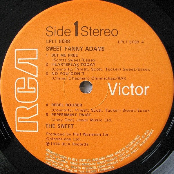 Original UK release in fully laminated sleeve on glossy non-paper RCA Victor labels. First catalogue number on cover, 2nd on labels. Our thanks to: • Pete (stick-drum) Coleman and Rod (how embarrassing) Harper at Audio International; • John Rollo and Steve Cooke at Essex Studio; • Geoff Young and Hugh Padgham at Advision Studios Special thanks to our road crew (Terry, Cuz, Bruno, and Jan) and the barmaid at the Barley Mow RCA Limited, Record Division, RCA House, Curzon Street, London W1 Printed in England by Robert Stace & Co Ltd Manufactured By RCA Limited, England From Master Recordings Of RCA Records. TM(s) ®Marga(s) Registrada(s) Used By Authority Of RCA Corporation. ℗ 1974 RCA Records B4 appears as "AC-DC" on cover, but as "AC/DC" on label. Publishing: • Sweet/Essex - A1, A2, A4, B1 to B3. • Chinnichap/RAK - A3, B4. • Jewel Music Ltd. - A5. Runouts are etched. E̶ stands for an E scratched out with X.