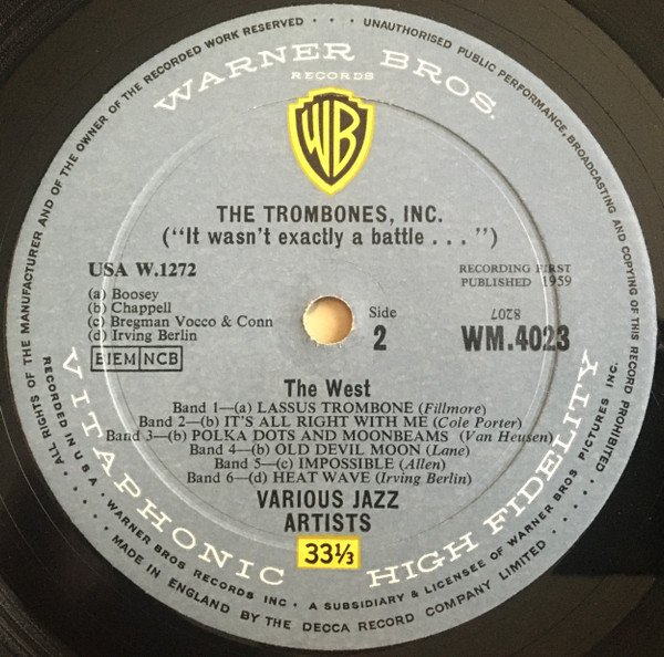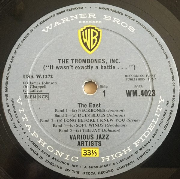 Sleeve credits the artist as "The Trombones, Inc" , Label credits "Various Jazz Artists"