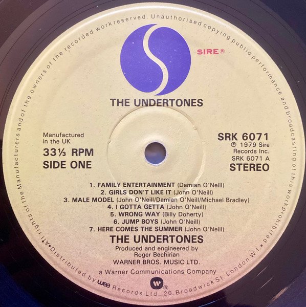 Original 1st edition UK release in fully laminated 'black & white' cover and printed red thick paper inner sleeve with die-cut rounded corners. Recorded in London and Mrs. Simms Shed Derry (Eden Studios not mentioned on release.) ℗ 1979 Sire Records Inc. © 1979 A Sire Recording Distributed by Wea Records Ltd. A Warner Communications Company. Printed and made in England by Garrod and Lofthouse Manufactured in the UK B7 is listed on label, but not on cover. [a206137] is credited as "Roger Becherian" on inner sleeve. Runouts are etched, except for the ‘2’, which appears stamped sideways on both sides.