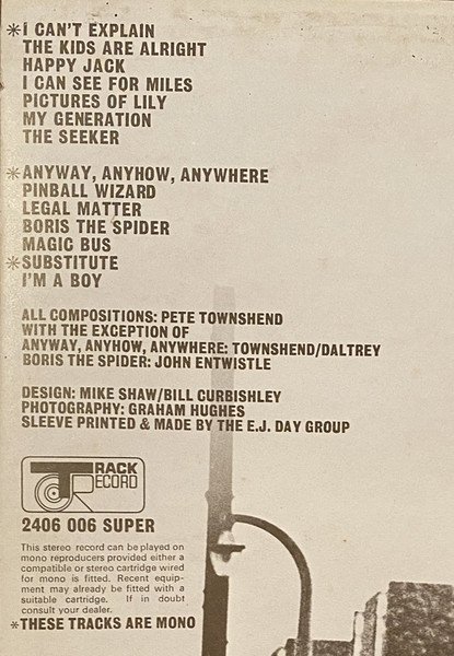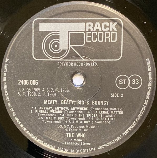 Mastering variant to other issues. This version otherwise similar to [r=5416852], with same label typesetting, and artist appearing below publisher, but gatefold inner without updated producer credits. Issued in gatefold jacket with sepia-toned inner liner, featuring original track list without replacement sticker. [A1, A2, A6, B1, B3] ℗ 1965. [A3, B4, B6, B7] ℗ 1966. [A4, A5] ℗ 1967. [B5] ℗ 1968. [B2] ℗ 1969 [A7] ℗ 1970 * Mono [A1, B1, B6] + Enhanced Stereo [B5] Made in Gt Britain Sleeve printed & made by the E.J. Day Group * These tracks are mono Track publishers: A1 to A7, B1 to B3, B5 to B7: Fabulous Music. B4: Essex Music Catalog number on back cover, inside gatefold: 2406 006 SUPER Catalog number on spine: SUPER 2406 006 Catalog number on labels: 2406 006 Title on spine, labels: Meaty, Beaty, Big & Bouncy Track A2 on label: Kids Are Alright Track B3 inside gatefold: Legal Matter