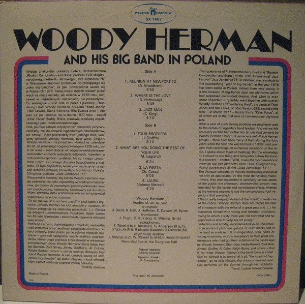 Made in Poland Recorded live at the Congress Hall - 1976 This disk has light blue labels. There is another release with [url=http://www.discogs.com/Woody-Herman-And-His-Big-Band-In-Poland/release/2190386]red labels[/url]