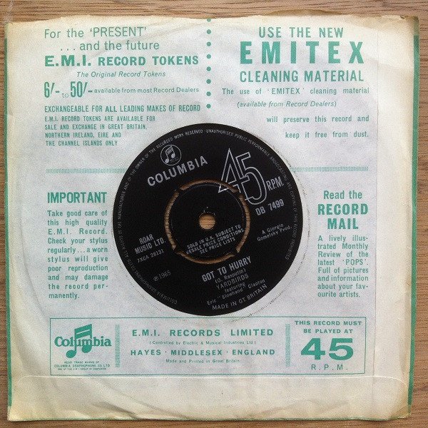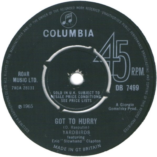 Issued on four-pronged Columbia labels, KT code embossed on centre A. Side A - Hermusic Ltd. Side B - Roar Music Ltd. Sold in the U.K. subject to resale price conditions see price lists Ⓟ1965 A Giorgio Gomelsky Prod. Made In Gt.Britain