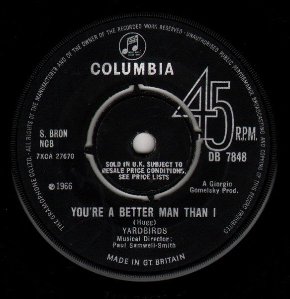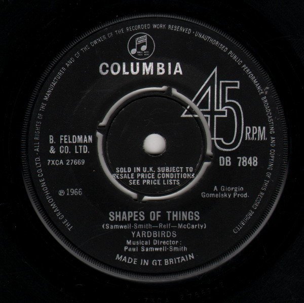 Four prong centre with "SOLD IN U.K. SUBJECT TO RESALE PRICE CONDITIONS, SEE PRICE LISTS" on both sides. Issued in Columbia sleeve. Publishers: Side A: B. Feldman & Co. Ltd. Side B: S. Bron A Giorgio Gomelsky Prod. MADE IN GT. BRITAIN ℗ 1966