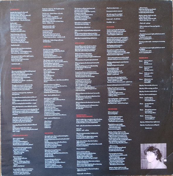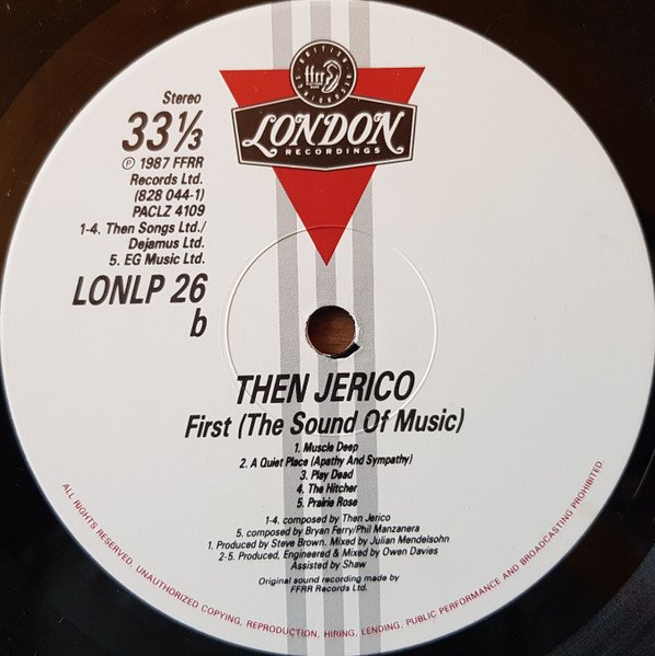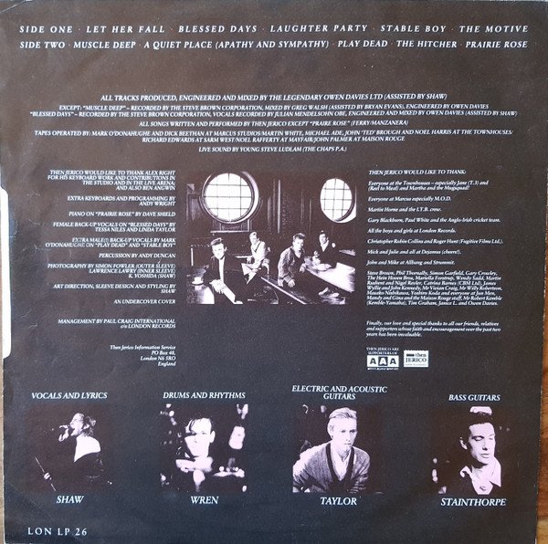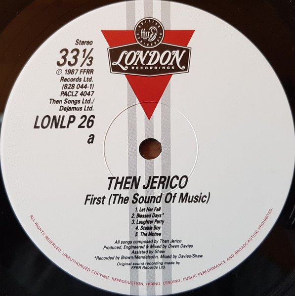 Identical to [url=https://www.discogs.com/release/248750]this release[/url] but with different runout and no poster. Identical to [url=https://www.discogs.com/release/11971633]this release[/url] but with ℗ FFRR Records Ltd. on labels. Either side of outer cover is opposite way up to the other. Issued with a printed inner sleeve. Printed on inner sleeve: Tapes operated by: Mark O'Donahughe and Dick Beethan at Marcus Studios/ Martin White, Michael Ade, John 'Ted' Brough and Noel Harris at The Townhouses/ Richard Edwards at Sarm West/ Noel Rafferty at Mayfair/ John Palmer at Maison Rouge. Live Sound by [...] (The Chaps P.A.) Then Jerico would like to thank Alex Right for his keyboard work and contributions in the studio and in the live arena: And also Ben Angwin Management by [...] c/o London Records Then Jerico information service PO Box 48, London N6 5RO England Then Jerico would like to thank: Everyone at The Townhouses - especially Jane (T.3) and (Reel to Meal) and Martha and the Mugsquad! Everyone at Marcus especially M.O.D. Martin Horne and the I.T.B. crew. Gary Blackburn, Paul White and the Anglo-Irish cricket team. All the boys and girls at London Records. Christopher Robin Collins and Roger Hunt (Fugitive Films Ltd.). Mick and Julie at Allbang and Strummit. Steve Brown, Phil Thornally, Simon Garfield, Gary Crowley, The Hein Hoven Bros., Mariella Forstrup [sic], Wendy Sadd, Martin Rushent and Nigel Kennedy, Mr Vivian Craig, Mr Willy Robertson, Masako Nishikawa, Yoshiro Koda and everyone at Jun Men, Mandy and Gina and the Maison Rouge staff, Mr Robert Kemble (Kemble-Yamaha), Tim Graham, Janice L. and Owen Davies. Finally, our love and special thanks to all our friends, relatives and supporters whose faith and encouragement over the past two years has been invaluable. The Jerico are supporters of AAA Artists Against Apartheid. Then Jerico made in London Printed on label: ℗ 1987 FFRR Records Ltd. Original sound recording made by FFRR Records Ltd. Side A: Then Songs Ltd./ Dejamus Ltd. Side B: B1-B4: Then Songs Ltd./ Dejamus Ltd. B5: EG Music Ltd.