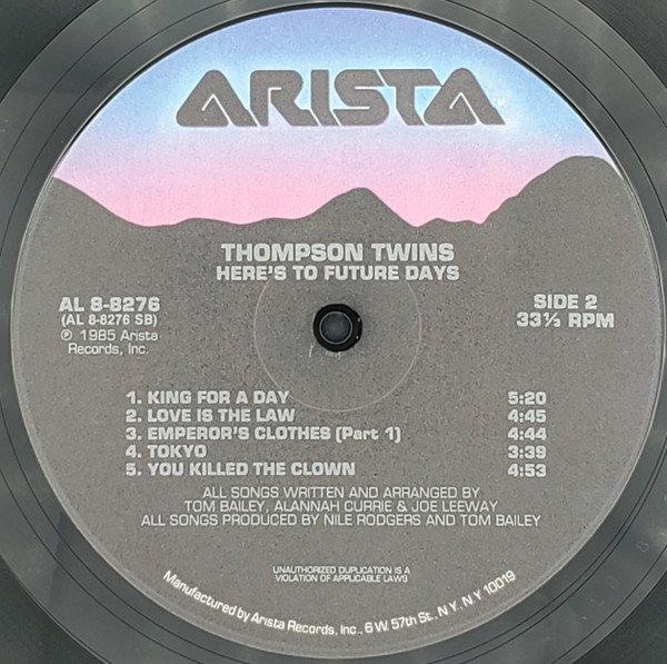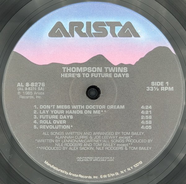 Catalog# on labels: AL 8-8276 Catalog# on back cover and spine: AL8-8276 ℗ & © 1985 Arista Records, Inc., 6 West 57th Street, New York, N.Y. 10019 Recorded at Marcadet and Guillaume Tell Studios, Paris, and at Skyline Studio, New York City Mixed at Skyline Studio, NYC Future Perfect Management: 321, Fulham Road, London, SW10 TT Fan Club (enclose S.A.E.): P.O. Box 468, London, S.W.10. 9.Q.W. Manufactured by Arista Records, Inc. Thanks to: [url=http://www.discogs.com/artist/Jimmy+Bralower]Jimmy Bralower[/url], [url=http://www.discogs.com/artist/Peter+Scherer]Peter Scherer[/url], [url=http://www.discogs.com/artist/Budd+Tunick]Bud Tunnick[/url] and [url=http://www.discogs.com/artist/Kevin+Jones+(3)]Kevin Jones[/url],([url=http://www.discogs.com/artist/Nile+Rodgers]Nile Rodgers[/url] assistants), all at Marcadet and Skyline. Fairlight, CMI. Dave Goodway, Syco Systems. [url=http://www.discogs.com/artist/Nile+Rodgers]Nile Rodgers[/url] appears by courtesy of [url=http://www.discogs.com/label/Warner+Bros.+Records]Warner Brothers Records[/url] [url=http://www.discogs.com/artist/Steve+Stevens]Steve Stevens[/url] appears by courtesy of [url=http://www.discogs.com/label/Chrysalis]Chrysalis Records[/url] Also released with [url=http://www.discogs.com/release/831280]different labels[/url] and same catalogue number. Track A1 and A2 Segue Variant 7 runout, Side A: Stamped except ARUN & I; Side B: Stamped except B