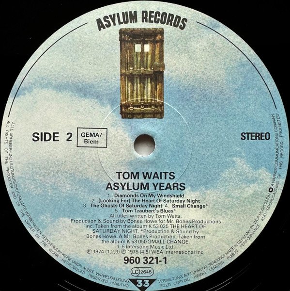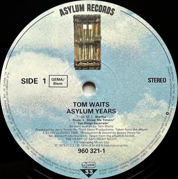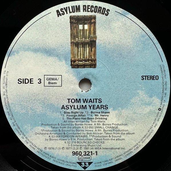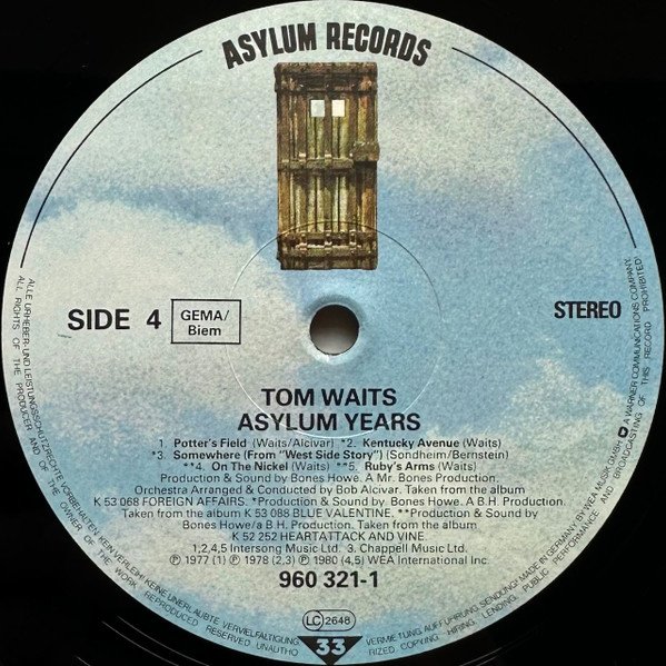 Label design variation of boxed "GEMA/Biem" on labels. Tracks A1 to A3 from [url=https://www.discogs.com/Tom-Waits-Closing-Time/master/13918]Closing Time[/url], 1973 tracks A4, A5, B1 to B3 from [url=https://www.discogs.com/Tom-Waits-The-Heart-Of-Saturday-Night/master/13942]The Heart Of Saturday Night[/url], 1974 tracks B4, B5, C1 and C5 from [url=https://www.discogs.com/Tom-Waits-Small-Change/master/14025]Small Change[/url], 1976 tracks C2, C3 and D1 from [url=https://www.discogs.com/Tom-Waits-Foreign-Affairs/release/950862]Foreign Affairs[/url], 1977 tracks D2 and D3 from [url=https://www.discogs.com/Tom-Waits-Blue-Valentine/master/14059]Blue Valentine[/url], 1978 track D4 and D5 from [url=https://www.discogs.com/Tom-Waits-Heartattack-And-Vine/master/14077]Heartattack And Vine[/url], 1980 track C4 (an unreleased Heartattack And Vine outtake) is also on [url=https://www.discogs.com/Tom-Waits-Bounced-Checks/release/804407]Bounced Checks[/url], 1981