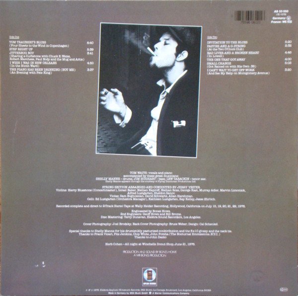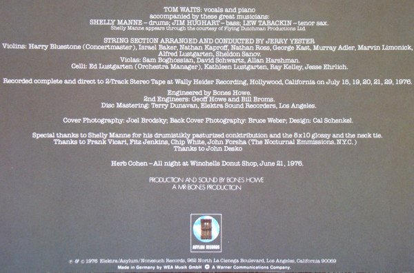 Glossy cover. Includes printed (b&w) poly-lined inner sleeve with lyrics Warner Logo embossed on rear cover Shelly Manne appears courtesy of Flying Dutchman Productions Ltd. Recorded complete and direct to 2-Track Stereo Tape at Wally Heider Recording, Hollywood, California on July 15, 19, 20, 21, 29, 1976. Disc mastering: Elektra Sound Recorders, Los Angeles. Special thanks to Shelly Manne for his drumistickly pasturized conktribution and the 8x10 glossy and neck tie. Thanks to Frank Vicari, Fitz Jenkins, Chip White, John Forsha (The Nocturnal Emmissions, N.Y.C.). Thanks to John Desko. Herb Cohen - All night at Winchells Donut Shop, June 21, 1976 A Mr Bones Production ℗ & © 1976 Elektra/Asylum/Nonesuch Records, 962 North La Cieneg Boulevard, Los Angeles, California 90069 Made in Germany by WEA Musik GmbH (W) A Warner Communications Company On the back cover, at the top right corner: AS 53 050 (7E-1078) Germany: ⓤ France: WE 381 On the back cover, at the bottom right corner: LC 2648 Runouts are stamped except for "SST" and the two digit numbers after the Alsdorf stamp, which are etched.