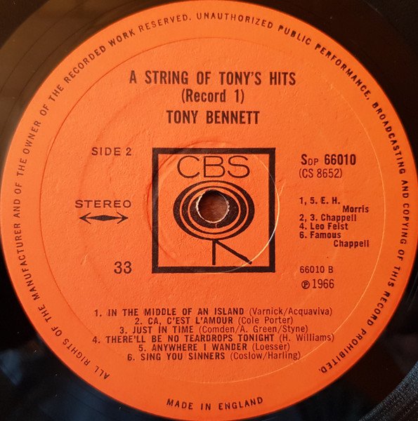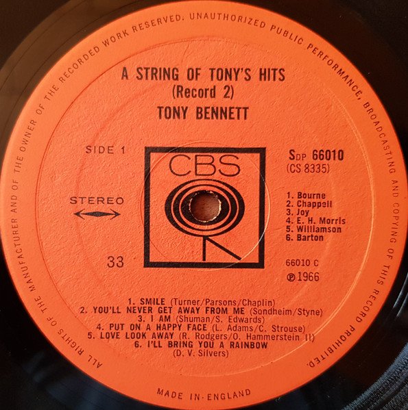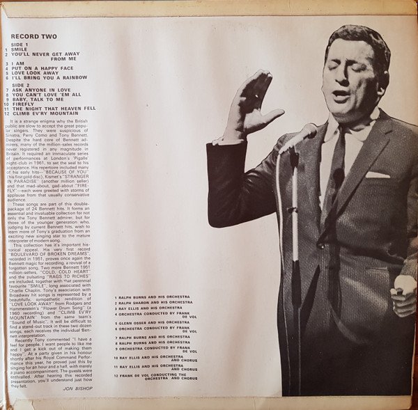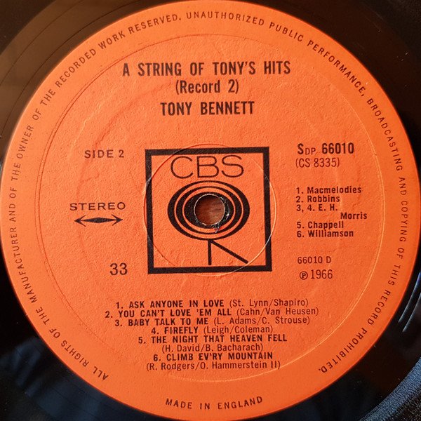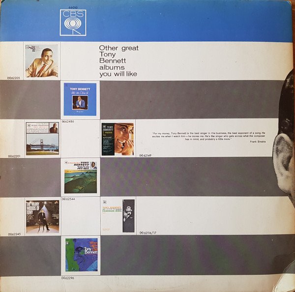 This release has printed "Stereo" on front cover. It exists a near identical release [url=https://www.discogs.com/release/5735070]without "Stereo"[/url] on front cover. Issued in a gatefold cover. Printed on backcover: Other great Tony Bennett albums you will like [url=https://www.discogs.com/master/406995]This Is All I Ask[/url] (s)62205 [url=https://www.discogs.com/master/361844]Who Can I Turn To[/url] (s)62486 [url=https://www.discogs.com/master/173001]I Left My Heart In San Francisco[/url] (s)62201 [url=https://www.discogs.com/master/356363]I Wanna Be Around[/url] (s)62149 [url=https://www.discogs.com/master/425791]If I Ruled The World (Songs For The Jet Set)[/url] (s)62544 [url=https://www.discogs.com/master/314453]The Many Moods Of Tony[/url] (s)62245 [url=https://www.discogs.com/master/265885]Tony Bennett With Ralph Sharon And His Orchestra - At Garnegie Hall Part 1[/url] (s)62116/17 [url=https://www.discogs.com/master/490738]Tony Bennett With The Ralph Sharon Trio - When Lights Are Low[/url] (s)62296 Printed on label: Made in England ℗ 1966 Side A: A1, A6: Frank Music A2: Acuff-Rose A3: Dash Music A4: Chappell A5: B. Feldman Side B: B1, B5: E. H. Morris B2, B3: Chappell B4: Leo Feist B6: Famous Chappell Side C: C1: Bourne C2: Chappell C3: Joy C4: E. H. Morris C5: Williamson C6: Barton Side D: D1: Macmelodies D2: Robbins D3, D4: E. H. Morris D5: Chappell D6: Williamson --------------------------- Original issue has the textured label , with the playing speed stated as '33' Initial covers have on the front a white sticker with <--STEREO--> in black print. Secondary, a gold sticker with 'Stereo' in black lettering, again adhered to the front. -----------------