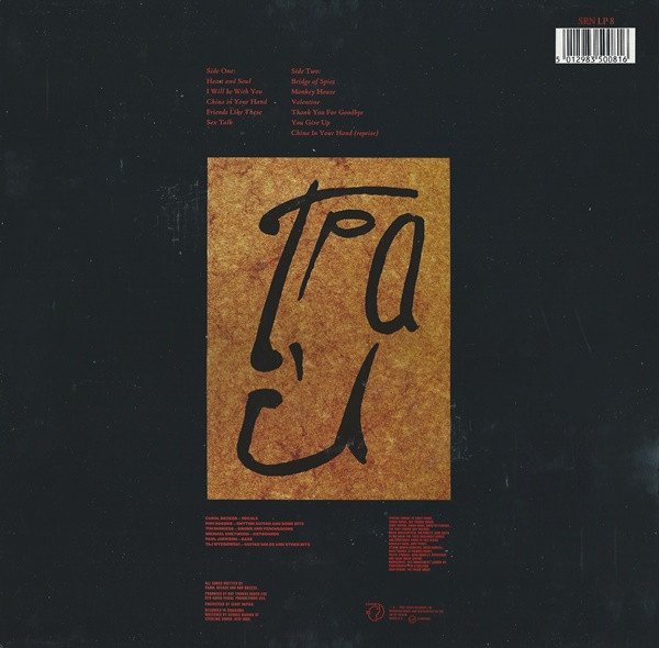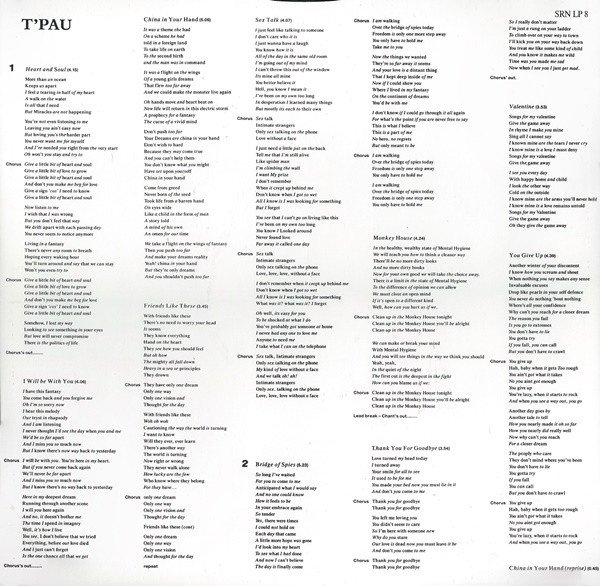 This version has side one/side two indicators on labels. ℗ & © 1987 Manufactured and distributed in the UK by Virgin. Siren is a Virgin company. A1, A2, A4, A5, B2, B3, B4 & B5 published by Amp Publishing Ltd. A3, B1 & B6 published by M15 (Publishing) Ltd. Produced for RTB Audio Visual Productions USA. Recorded in Fabarama. Mastered at Sterling Sound, New York. Management: M15 Management, London, W1. Issued with a custom printed inner sleeve containing lyrics on one side and the T'Pau logo on the other. Runouts: Side A: C indicates mastering was from an alternate source (not master tape), D indicates DMM (copper plate not a lacquer). Side B: U indicates lacquer was cut a non-EMI studio