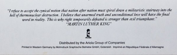 ℗ 1984 Original Sound Recording made by Island Records Ltd. Printed in Western Germany by Mohndruck Graphische Betriebe GmbH, Gütersloh [Debossed non-ink "00" stamp in lower right corner of the rear sleeve] Ariola-Eurodisc GmbH, München [labels] This version has the small circled R next to Island on labels. The version without this R is found here: [r8052175].