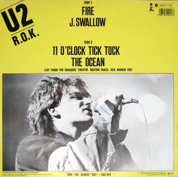 First re-issue with: - MAXI-SINGLE 45t printed on the front cover (upper right corner) - Cat# and barcode on the back cover (upper right corner) - Distributor, copyright information and 'And the album "Boy" » 202.913' are printed along the bottom edge of the back cover - Island logo on each label has an additional ® - Track A2 listed as 'J. Swallow' on the sleeve & 'Johnny Swallow' on the label. - Printed in Western Germany Embossed "bass clef" symbol on B-side label. B1 & B2 - Live From The Paradise Theatre Boston-Mass. USA March 1981