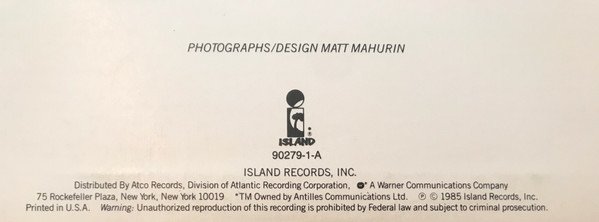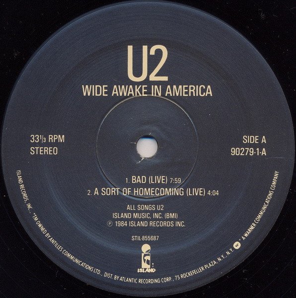 [r=13153238] is also a [l27576], but has an additional copyright text on rear sleeve. [r=473126] was pressed by [l211933] and mastered at [l264158]. Matte cover. Generic inner sleeve with rounded corners. On back cover: A special low priced collection of live recordings and out takes from [url=http://www.discogs.com/U2-The-Unforgettable-Fire/release/507725]The Unforgettable Fire[/url] tour and album • 1984-85. Distributed by Atco Records, Division of Atlantic Recording Corporation A Warner Communications Company. ℗ © 1985 Island Records, Inc. Printed in U.S.A. On labels: Side A: Island Music, Inc. (BMI) ℗ 1984 Island Records Inc. Side B: U2 (PRS) ℗ 1985 Island Records Inc. Rim text: Island Records, Inc., *TM owned by Antilles Communications Ltd., Dist. By Atlantic Recording Corp., 75 Rockefeller Plaza, N.Y., N.Y. A Warner Communications Company. On runouts: All is etched except SRC logo stamped "SRC" logo denotes a [l27576] pressing. "Precision" appears as "Precision̲"