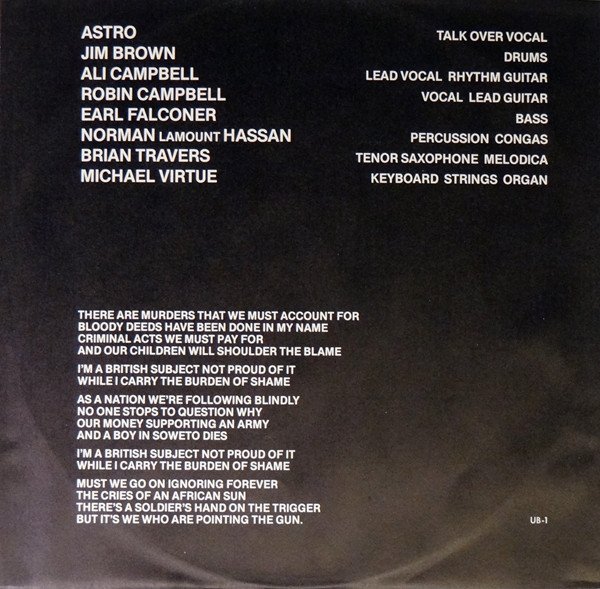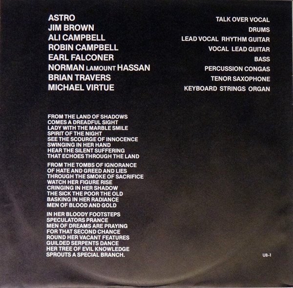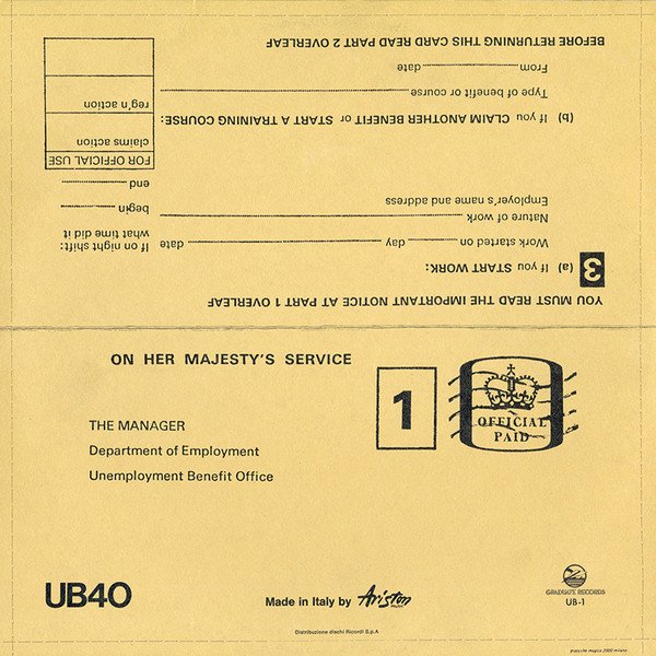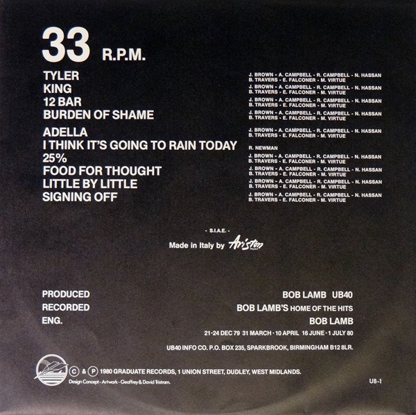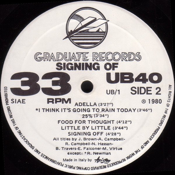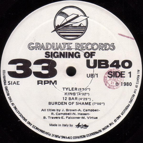 Made in Italy by Ariston Music Distribuzione dischi Ricordi S.p.A. grapyche magica 2000 milano © & ℗ 1980 Graduate Records, 1 Union Street, Dudley, West Midlands. UB40 Info Co. P.O.Box 235, Sparkbrook, Birmingham B12 8LR. [Tracks A1 to B6] Recorded [at] Bob Lamb's Home Of The Hits 21-24 Dec 79 31 March-10 April 16 June-1 July 80 [Tracks C1 to D] Recorded [at] The Music Center 18-19-20 July 80 Released in printed inner sleeves. The album title is misspelled as "Signing Of" on labels. Runouts are etched, except for the stamped CGD logo. Cat# UB-1 on the cover, spine and inner sleeves Cat# UB/1 on the labels