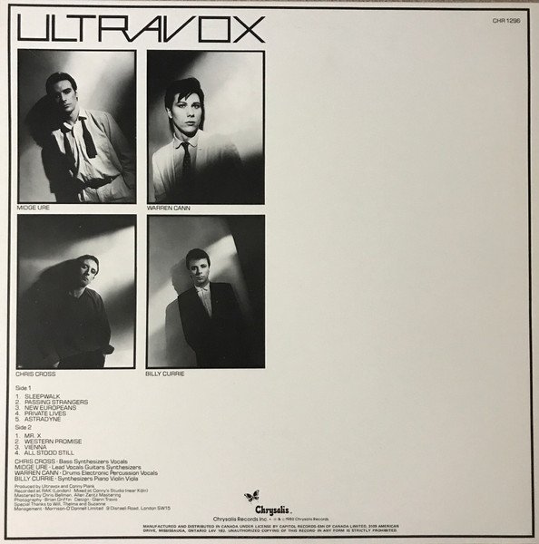 This is the Canadian release on Chrysalis, there is also a UK release that has the same Cat# however the two releases are different. The front covers only vary on the size of the border, whereas the rear covers whilst using the same images are laid out on opposite sides to each other. The US release shows the images on the LHS. The major difference though is with the track listing on the A-side of both releases, the UK release starts with "Astradyne" and ends with "Sleepwalk". Both releases share the same track listing on the B-side. Made in Canada Black & white Chrysalis label.