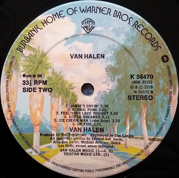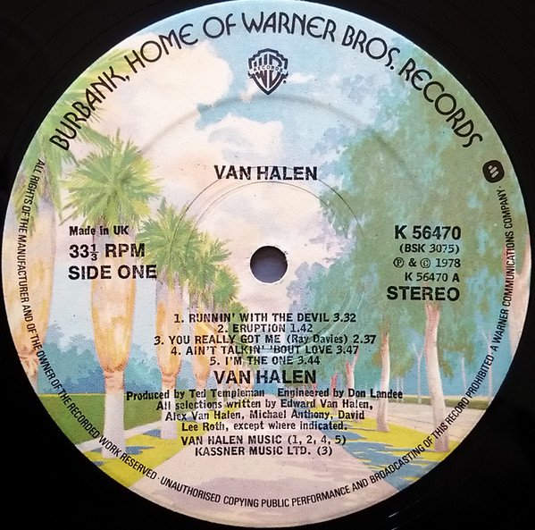 This version looks identical to [r1698894] but "Allen" in runouts denote lacquers were cut by Allen Landau. On labels: Made in UK ℗ & © 1978 All songs published by Van Halen Music, except A3 by Kassner Music Ltd. and B5 by Tristan Music Ltd. Runouts are etched except for the letters at 9 o’clock and digits at 3 o’clock.