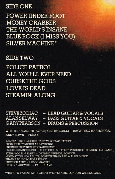 On back cover: Recorded Jan/Feb 1981 - Rock City - Shepperton Studios, London - England Extra vocal & piano - Olympic Studios, London Mixed at The Nova Suite, London On labels: All tracks published by Catapult Music except: Track A5 published by United Artists Music Made in U.K. On runouts: All is etched