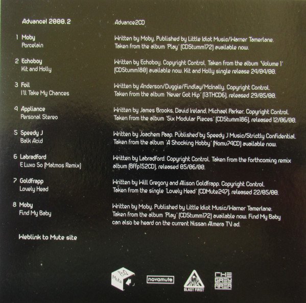 In cardboard sleeve with inner card sleeve. ℗ + © 2000. Made in Great Britain. Enhanced section contains link to Mute website. Tracks taken from the album: #1 and #8 '[m=82202]' #2 '[m=120324]' #3 '[m=318344]' #4 '[m=38232]' #5 '[m=40037]' #6 from the forthcoming remix album (Bffp152CD). #7 Single '[m=37133]'