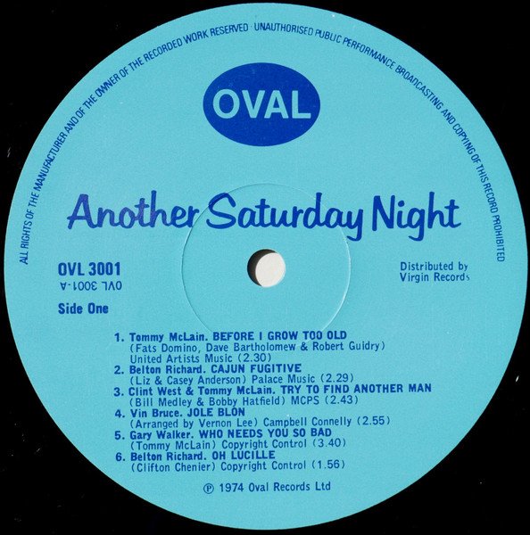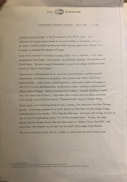 All tracks produced for Jin & Swallow Records in Ville Platte, Louisiana, except "Jole Blon" at KLEB Radio Station in Golden Meadow, Louisiana. ℗ 1974 Oval Records, distributed by Virgin Records, 119 Portobello Road, London W11. There is an otherwise identical version [url=http://www.discogs.com/release/1239999]here[/url] that has (p) 1973. This version definitely says (p) 1974 on sleeve and labels. Runout markings are stamped.