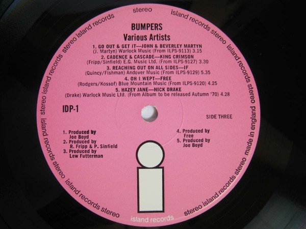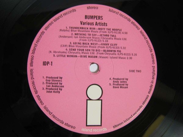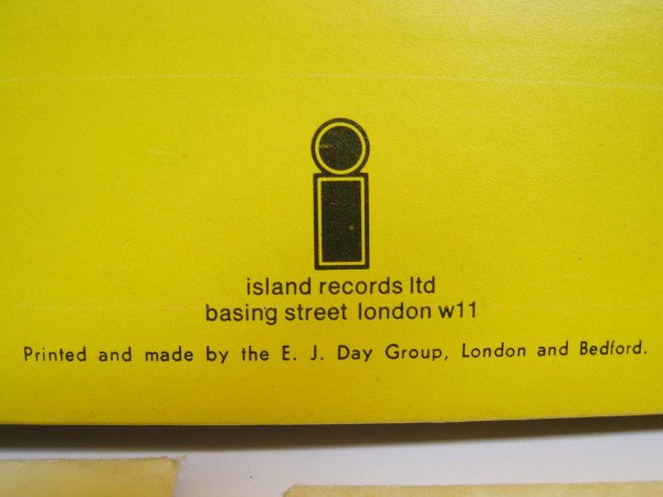 1st Issue, Pink Island Copy, smooth labels, Gatefold Cover Island Records Ltd Basing Street London W11 Printed and made by the E. J. Day Group, London and Bedford. A1 - Island Music (from ILPS 9116 — John Barleycorn Must Die) A2 - Blue Mountain Music (from ILPS 9134 — Bronco. Released—Autumn '70) A3 - Northern Songs (from ILPS 9117 — Last Puff) A4 - Blue Mountain Music (from ILPS 9128 — Quintessence) B1 - Blue Mountain Music (from ILPS 9119 — Mad Shadows) B2 - Ian Anderson Music/Chrysalis Music Ltd. (from ILPS 9123 — Benefit) B3 - Blue Mountain Music (from ILPS 9133 — Jimmy Cliff. Released Autumn '70) B4 - Chrysalis Music Ltd. (from Chrysalis ILPS 9122 — Getting To This) B5 - Island Music C1 - Warlock Music (from ILPS 9113 — Stormbringer) C2 - E. G. Music Ltd. (from ILPS 9127 — In the Wake of Poseidon) C3 - Andover Music (from ILPS 9129 — If) C4 - Blue Mountain Music (from ILPS 9120 — Fire & Water) C5 - Warlock Music Ltd. (from his album to be released Autumn, '70) D1 - Warlock Music Ltd. (from ILPS 9130 — Full House) D2 - Freshwater Music (from ILPS 9118 — Mona Bone Jakon) D3 - Renaissance Music Ltd. (from ILPS 9114 — Renaissance) D4 - Warlock Music (from ILPS 9125 — Fotheringay) D5 - Chrysalis Music Ltd. (from their Chrysalis Album to be released Autumn, '70)
