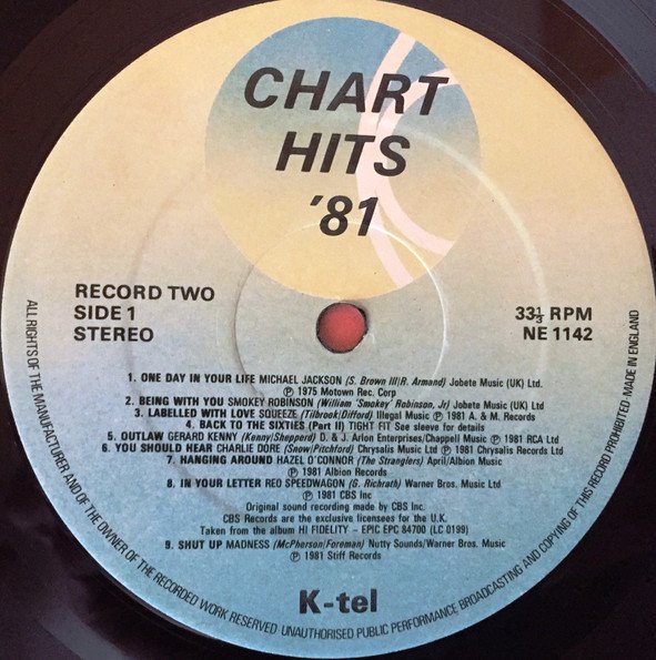 Has artist credits on front cover. On back cover: Also available on tape A8: Original sound recording made by CBS Inc. CBS Records are the exclusive licensees for the U.K. Taken from the album [url=https://www.discogs.com/master/view/95203]Hi Fidelity[/url] [sic] - Epic EPC 84700 (LC 0199) B6: Original sound recording made by CBS Records (LC 0199) B9: Original sound recording made by CNR Holland B.V. CBS Records are the exclusive licensees for the U.K. Taken from the album [url=https://www.discogs.com/Starsound-Stars-On-45-The-Album-Volume-2/release/1773538]Stars On 45 Vol. 2[/url] - CBS 85181 (LC 0149) B10: Original sound recording made by CBS Records Taken from the album [m=246423] - Epic EPC 84985 (LC 0199) Compiled in association with Motown, A&M, Jive, RCA, Chrysalis, DEP Intern., Albion, CBS, Stiff, Polydor, Virgin, Dindisc, Safari, KA and Towerbell. All music contained herein is produced from the original master recordings, under licence from major record companies. To ensure the highest quality reproduction the running times of some of the titles have been amended. K-tel's music products are manufactured by major suppliers, from the highest quality materials available. © 1981 K-tel International ® 1981 K-tel International K-tel International (UK) Ltd. K-tel International (IRL) Ltd. On labels: Made in England Chart Hits '81 Record Two A1 Jobete Music (UK) Ltd. ℗ 1975 Motown Rec. Corp. A2 Jobete Music (UK) Ltd. A3 Illegal Music ℗ 1981 A. & M. Records A5 D. & J. Arlon Enterprises /Chappell Music ℗ 1981 RCA Ltd. A6 Chrysalis Music Ltd. ℗ 1981 Chrysalis Records Ltd. A7 April/Albion Music ℗ 1981 Albion Records A8 Warner Bros. Music Ltd. ℗ 1981 CBS Inc. A9 Nutty Sounds/Warner Bros. Music ℗ 1981 Stiff Records B1 St Anne's Music ℗ 1981 Polydor Ltd (UK) B2 Dinsong ℗ 1981 Dindisc B3 New Claims/ATV Music ℗ Dep International B4 Sweet 'N' Sour Songs/Urgent/DJM ℗ 1981 Safari Records B5 Sunbury Music ℗ 1981 RCA Ltd B6 Graham Music Pub. Ltd/Heath Levy Music Co. Ltd/Bixpy Music Ltd ℗ 1981 CBS Records B7 Copyright Control ℗ 1981 KA Records B8 The England Pub. Co ℗ 1981 Towerbell Records B9 ℗ 1981 CNR holland [sic] B.V. B10 Leeds Music Ltd ℗ ©1981 CBS Records [r=927388] has artist credits on front cover, pressed by PRS Ltd. [r=7608664] has artist credits on front cover, pressed by Damont, no mastering credit. [r=6058442] has no artist credits on front cover, unknown pressing, no mastering credit. [r=7820681] is pressed by MVS (Record Pressing) Ltd.