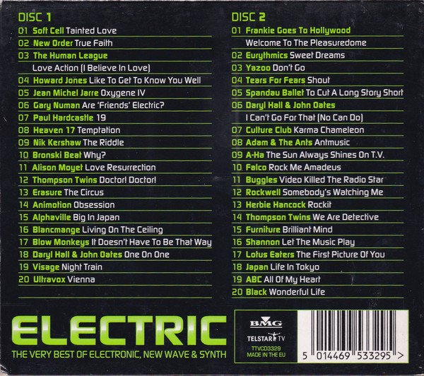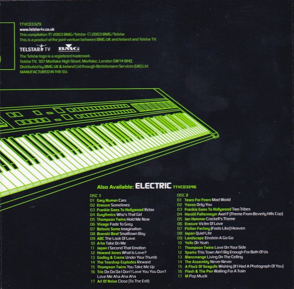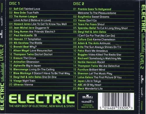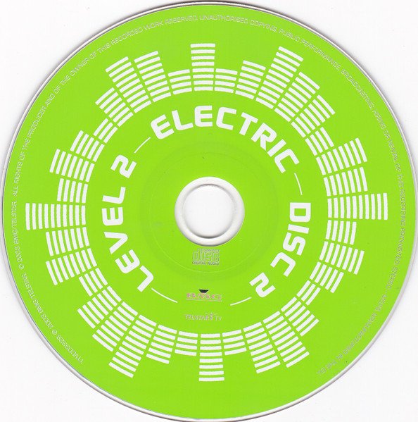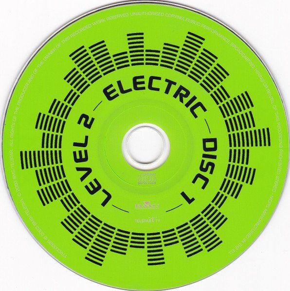 A two-CD compilation was supplied in a jewel case. Some releases, however, were also provided with an outa-cardboard-slipcase. [CDs]: BMG [logo] TELSTAR [logo] TV TTVCD3329 ℗ 2003 BMG/TELSTAR. © 2003 BMG/TELSTAR. STEREO - MCPS. MANUFACTURED IN THE EU. [Cover - front]: LEVEL 2 ELECTRIC THE VERY BEST OF ELECTRONIC, NEW WAVE & SYNTH [Cover - spine]: ELECTRIC LEVEL 2 BMG [logo] TELSTAR [logo] TV TTVCD3329 [Cover - back]: ELECTRIC BMG [logo] THE VERY BEST OF ELECTRONIC, NEW WAVE & SYNTH TELSTAR [logo] TV TTVCD3329 MADE IN THE EU 5 014469 533295 > [Note]: Track 1-06 is misprinted as by Gary Numan. This is the original single version, released by his band Tubeway Army [r=64661] in 1979—corrected above. [Erratum]: Additional track information, per booklet: Track 1-11: Digitally mixed at [l268342], London. Track 2-03: Taken from the album '[m=17080]'.