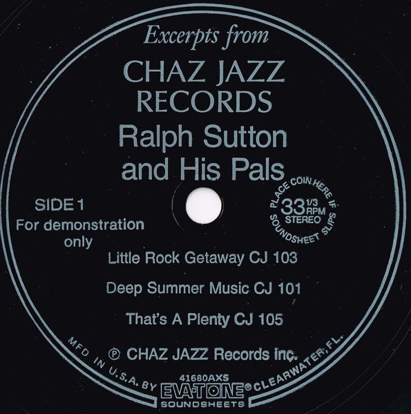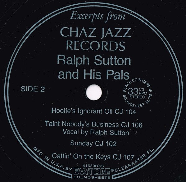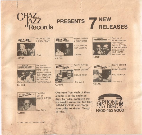 Title on sleeve front is: Ralph Sutton Singin', Swingin' and Scufflin' with his Pals! Rear of sleeve reads: Chaz Jazz Records presents 7 New Releases "One tune from each of these albums is on the enclosed disc. To order, complete the enclosed form or dial toll free 1-800-453-9000 and charge your order to Master Charge or Visa. Phone A Disc 1-800-453-9000