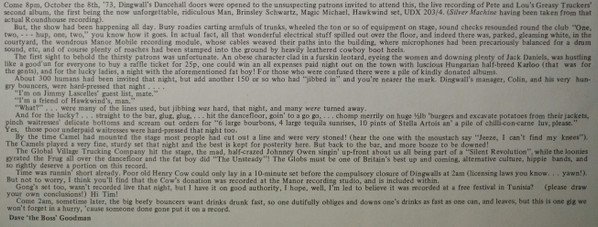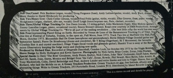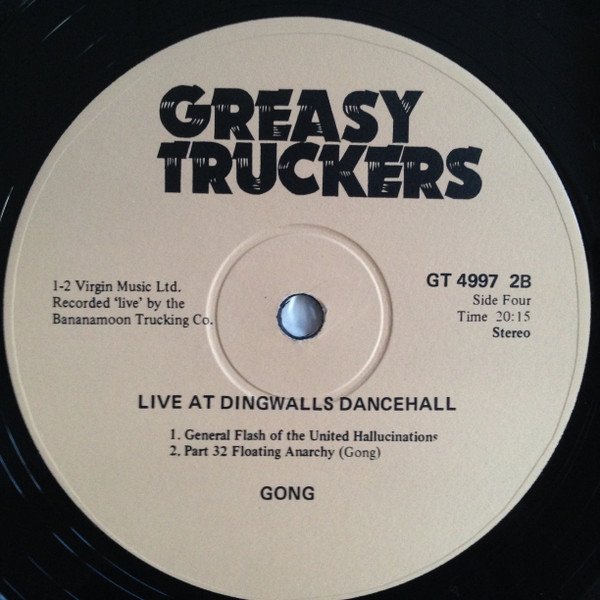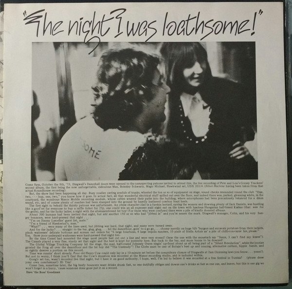 This is the 1st press which includes a large insert (later deleted) with a photo and an article by Dave Goodman titled "The Night I was Loathsome!". Also the graphics inside the gatefold cover are in the correct position with the shoe on the left side (later press has the shoe on the right). Side A & C recorded 8th October 1973 at Dingwalls Dance Hall, Camden Lock. Side B recorded 4th November 1973 at The Manor. Track D1 recorded live June 1973 at Festival of Tabarka, Tunisia. Track D2 recorded live October 1973 at Sheffield City Hall. From insert: "The Night I Was Loathsome! Come 8pm, October the 8th, '73, Dingwall's Dance Hall doors were opened to the unsuspecting patrons invited to attend this, the live recording of Pete and Lou's Greasy Truckers' second album, the first being the now unforgettable, ridiculous Man, Brinsley Schwartz, Magic Michael, Hawkwind set, UDX 203/4. (Silver Machine having been taken from that actual Roundhouse recording). But, the show had been happening all day. Busy roadies carting armfuls of trunks, Wheeled the ton or so of equipment on stage, sound checks resounded round the club "One, two, --- hup, one, two," you know how it goes. In actual fact, all that wonderful electrical stuff spilled out over the floor, and indeed there was, parked, gleaming white, in theh courtyard, the wondrous Manor Mobile recording module, whose cables weaved their path into the building, where microphones had been precariously balanced for a drum sound, etc, and of course plenty of roaches had been stamped into the ground by heavily leathered cowboy boot heels. The first sight to behold the thirsty patrons was unfortunate. An obesed character clad in a furskin leotard, eyeing the women and downing plenty of Jack Daniels, was hustling like a good'un for everyone to buy a raffle ticket for 25p, one could win an all expenses paid night out on the town with luscious Hungarian half-breed Karloo (that was for the gents), and for the lucky ladies, a night with the aforementioned fat boy! For those who were confused there were a pair of kindly donated albums. About 300 humans had been invited that night, but add another 150 or so who had "jibbed in" and you're nearer the mark. Dingwall's manager, Colin, and his very hungry bouncers, were hard-pressed that night.... "I'm on Jimmy Lascelle's guest list, mate." "I'm a friend of Hawkwind's, man." "What?" ...were many of the lines used, but jibbing was hard, that night, and many were turned away. And for the lucky? ...straight to the bar, glug, glug,... hit the dancefloor, goin' to a go go,... chomp merrily on huge 1/2lb 'burgers and excavate potatoes from their jackets, pinch waitresses' delicate bottoms and scream out orders for "6 large bourbons, 4 large tequila sunrises, 10 pints of Stella Artois an' a pile of chili-con-carne luv, please." Yes, those poor underpaid waitresses were hard-pressed that night, too. By the time Camel had mounted the stage most people had cut out a line and were very stoned! (hear the one with the moustache say "Jeeze, I can't find my knees") The Camels played a very fine, sturdy set that night and the best is kept for posterity here. But back to the bar, and more booze to be downed! The Global Village Trucking Company hit the stage, the mad, half-crazed Johnney Owen singin' up-front about us all being part of a "Silent Revolution", while the loonies gyrated the Frug all over the dance floor and the fat boy did "The Unsteady"! The Globes must be one of Britain's best up and coming, alternative culture, hippie bands, and so rightly deserve a portion on this record. Time was runnin' short already. Poor old Henry Cow could only lay in a 10-minute set before the compulsory closure of Dingwalls at 2am (licensing laws you know... yawn!). But not to worry, I think you'll find that the Cow's donation was recorded at the Manor recording studio, and is included within. Gong's set, too, wasn't recorded live that night, but I have it on good authority, I hope, well, I'm led to believe it was recorded at a free festival in Tunisia? (please draw your own conclusions!) Hi Tim! Come 2am, sometime later, the big beefy bouncers want drinks drunk fast, so one dutifully obliges and downes one's drinks as fast as one can, and leaves, but this is one gig we won't forget in a hurry, 'cause someone done gone put it on a record. -Dave "The Boss" Goodman " "Shakti Yoni is away at the Bananamoon Observatory keeping the bulge warm and studying new spells." A Greasy Truckers Production. Greasy Truckers do gigs, free festivals, albums and other alternative things. Distributed by Island Records Limited. ℗ © 1973 Printed and made by the F. J. Day Group, London and Bedford This is a stereo record and should be played.